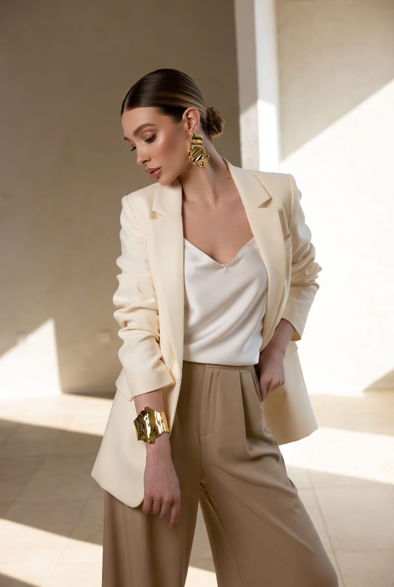 A sharp, tailored blazer instantly elevates denim, silk skirts, or wide-leg trousers.